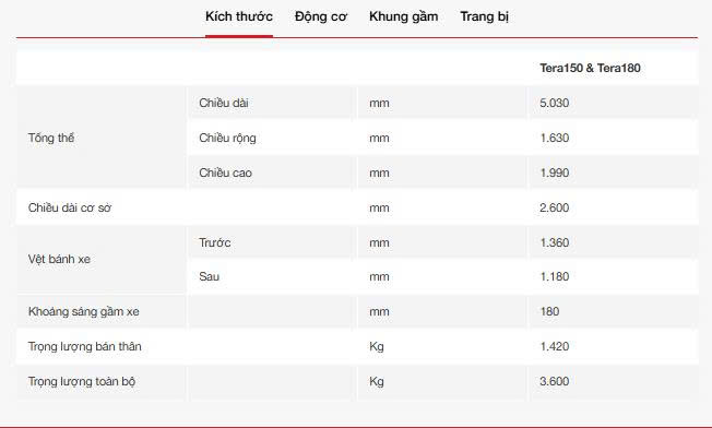 Sở hữu thiết kế hiện đại, động cơ Diesel 1.8L bền bỉ, tiết kiệm nhiên liệu, “chiến binh” xe tải nhẹ Tera180 & Tera150 có tải trọng lần lượt 1T8 & 1T5 với thùng hàng 3,3 mét là một trong những sự lựa chọn đáng giá cho các bác tài. Sở hữu hàng loạt ưu điểm thiết kế và tính đa dụng, mẫu xe Tera180 & Tera150 là giải pháp đáp ứng tối đa nhu cầu của khách hàng về vận chuyển hàng hóa trong và ngoài đô thị đang ngày càng tăng lên tại Việt Nam.
