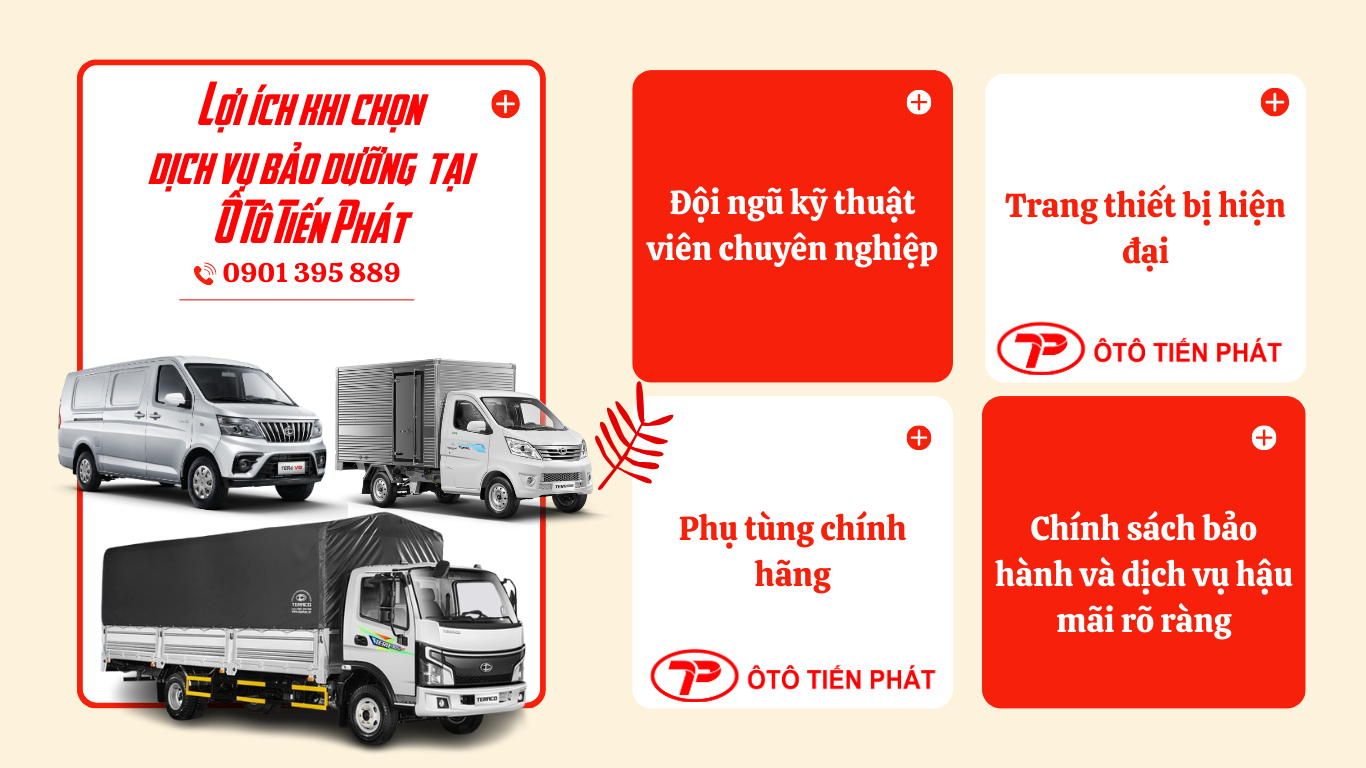 Với khách hàng khu vực Bình Tân, Quận 9, Thủ Đức, Hóc Môn, Bình Chánh, Ô Tô Tiến Phát triển khai dịch vụ kỹ thuật lưu động (Mobile Service) và trạm bảo hành vệ tinh, đảm bảo hỗ trợ ngay tại địa phương: