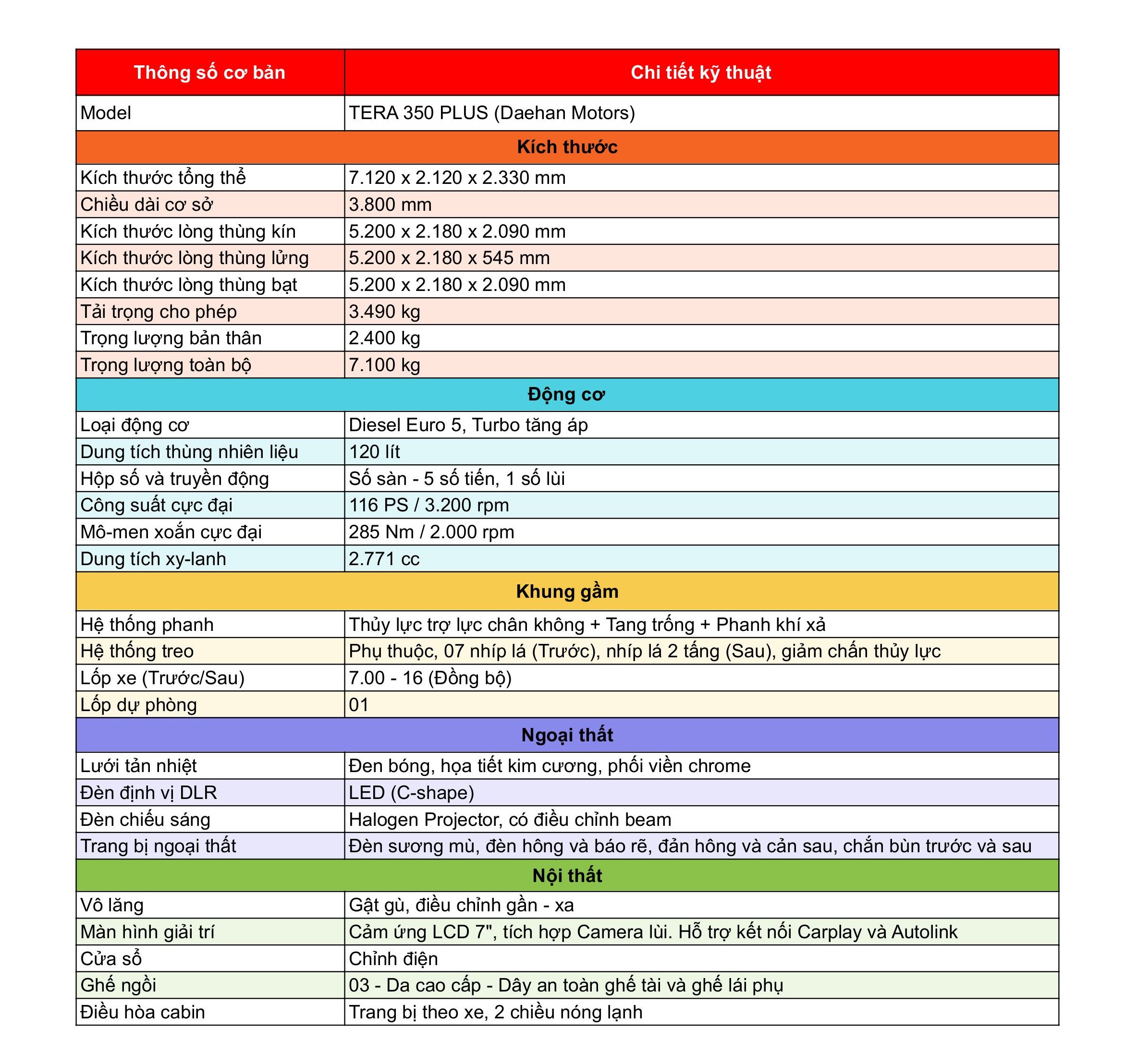 Thông Số Kỹ Thuật Chi Tiết Xe Tải TERA 350 PLUS